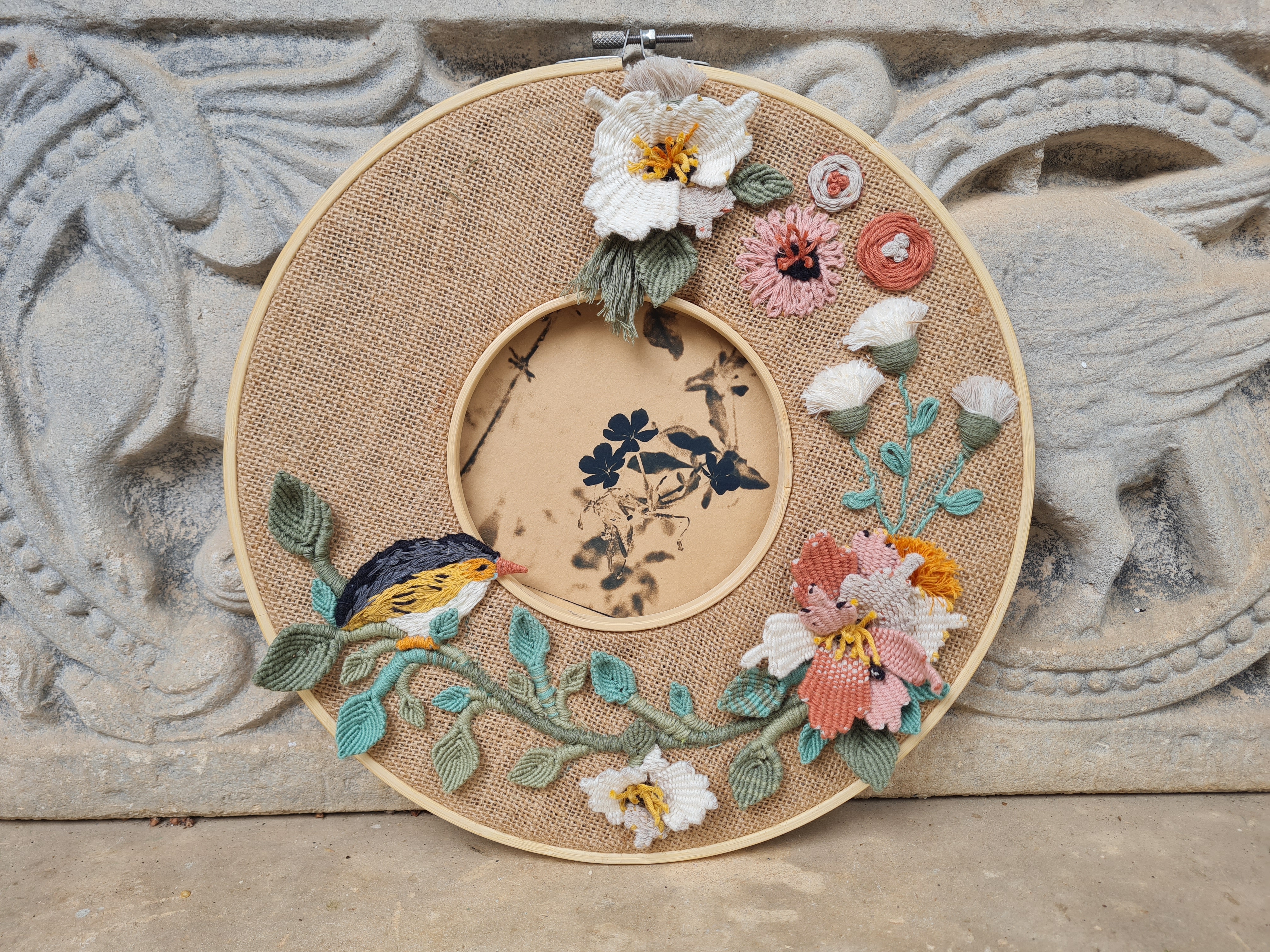 Para el soporte o base del bordado utilicé chapa de madera a la que le dí una imprimación metálica, taladré agujeros y cosí el hexágono y líneas con hilo perlé. Dibujé el ojo y oreja con lápiz de grafito y cosí líneas con puntada libre y paso atrás con hilo de coser. Una franja cosida en nudo corbatín separa el hexágono en 2 mitades.